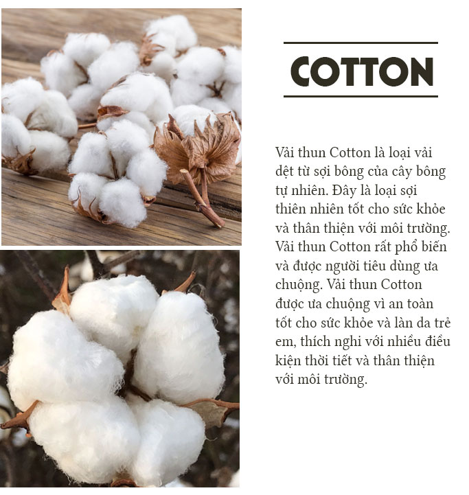 Cotton- Với khả năng chống co rút, bề mặt vải mịn và bền chắc hơn, sẽ giúp áo choàng vẫn đứng form sau thời gian dài sử dụng. Đồng thời do cấu trúc vải được hình thành bởi các vòng sợi đan xen vào nhau theo chiều ngang, áo choàng sẽ có độ dẻo dai và tương tác với thân nhiệt cơ thể tốt hơn. Bề mặt vải Cotton mịn, dai và đanh hơn, khiến cho việc vệ sinh áo choàng khi trẻ dính bẩn cũng trở nên dễ dàng hơn so với vệ sinh bề mặt của vải xô Muslin.