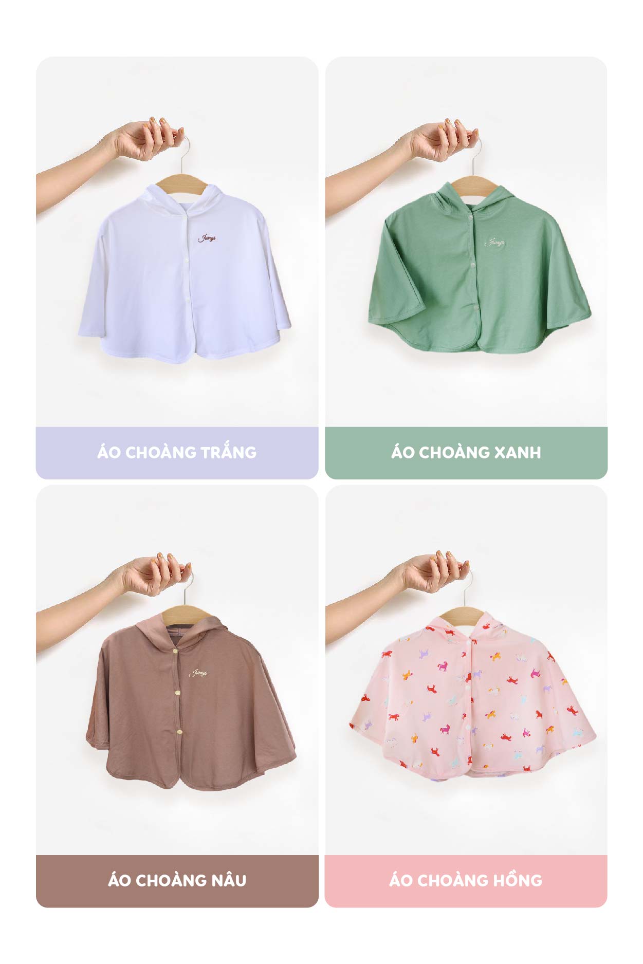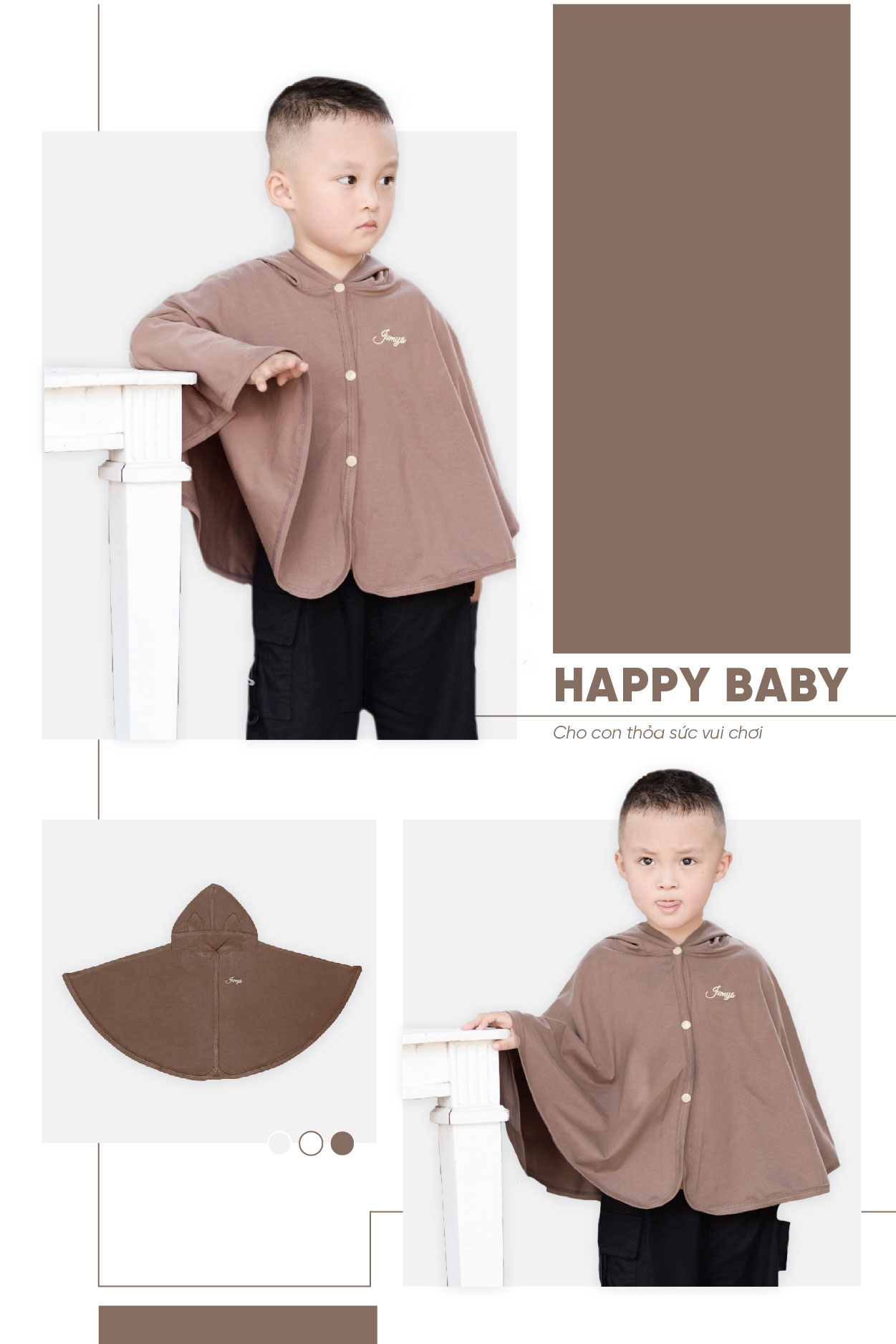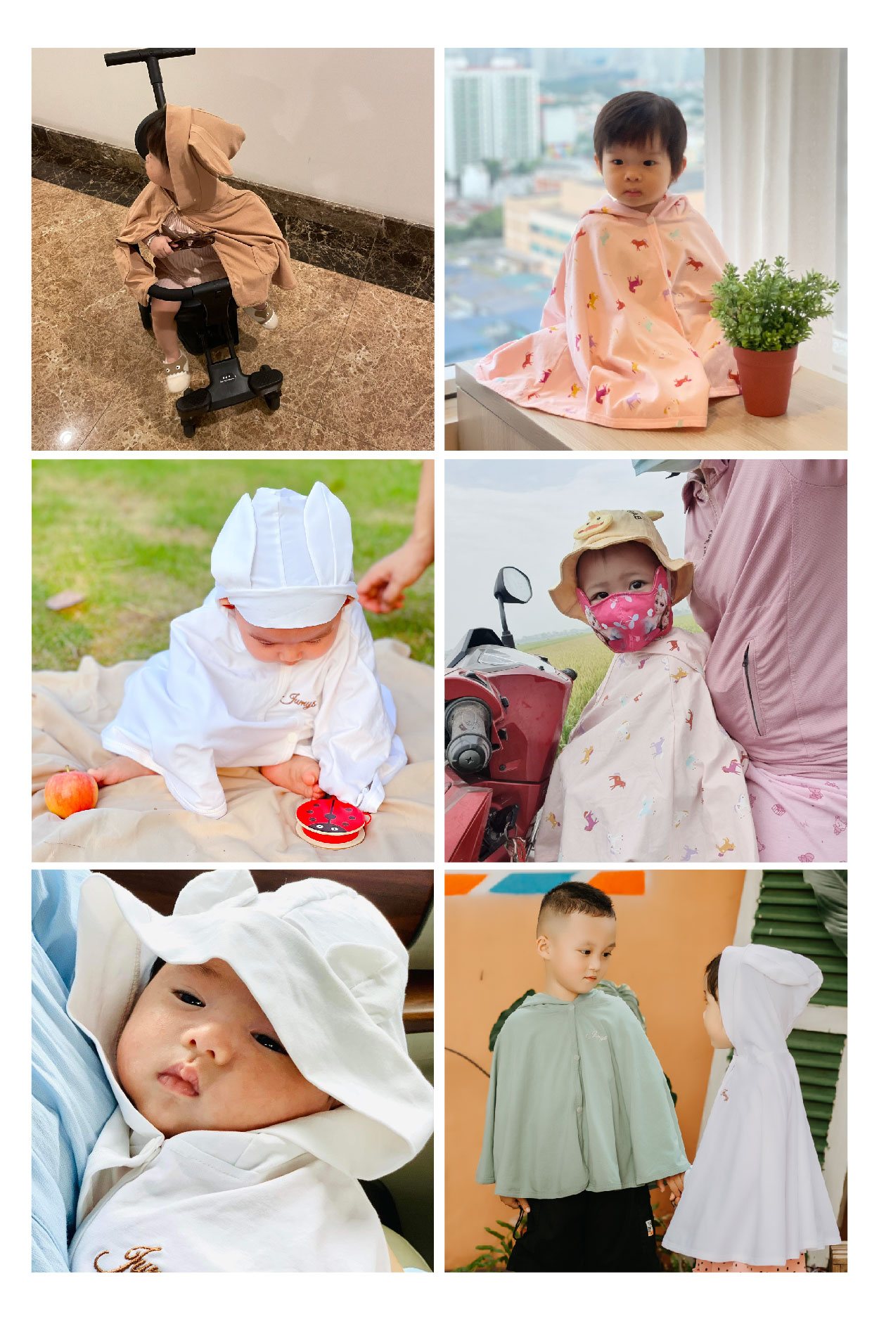 Kiểu dáng cánh dơi, thiết kế rộng thoáng đem lại sự thoải mái vận động cho bé yêu, đồng thời cũng giúp bé che nắng, che gió. Áo choàng chống nắng cho bé được thiết kế đường viền với độ dày phù hợp để dáng áo luôn được phẳng và có độ rũ nhất định. Từng đường may được thiết kế tỉ mỉ, tinh tế và đẹp mắt, giúp cho áo có độ bền hoàn hảo với thời gian. Chất liệu vải phẳng phiu mà mẹ thậm chí có thể cảm nhận thông qua hình ảnh, bé chắc chắn sẽ cực kì xinh xắn đáng yêu trong chiếc áo choàng này. Jumy’s tin rằng sự tỉ mỉ và chỉn chu trong từng sản phẩm sẽ làm ba mẹ yên tâm hơn khi tin tưởng lựa chọn nhà JUMY’S.
